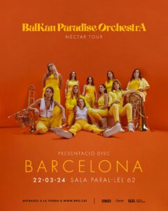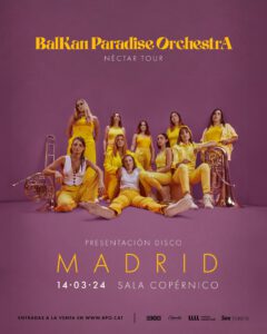 A lo largo de 2023, Balkan Paradise Orchestra han llevado su espectáculo ‘Catársis’ por todo el mundo, actuando en Nueva York ,Canadá, Alemania, Holanda y Francia entre otros países. La música de BPO es universal, no entiende de fronteras y así continuarán demostrando en 2024 con la salida de su nuevo disco. Con todas estas novedades llega también el anuncio de la gira de presentación que las llevará, por ahora, a Madrid, Valencia y Barcelona el próximo mes de marzo. Las entradas ya están a la venta.