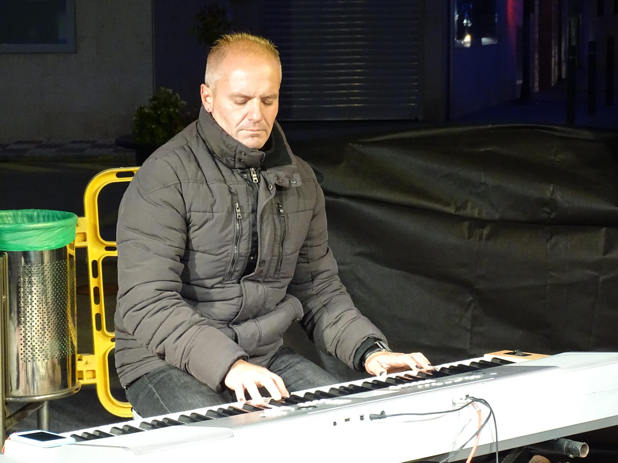 El tercer artista y complemento perfecto para estos Mini-Conciertos fue Ángel (Chus) Porrero, un todo terreno en el mundo de la música, del espectáculo, un excelente pianista, el teclado es su vida, su extenso repertorio abarca todos los estilos musicales desde jazz, pasando por blues, pop, rock, etc. y ayer, a pesar del frío, demostró su virtuosidad con el piano acompañando a estas dos artistas en el escenario.